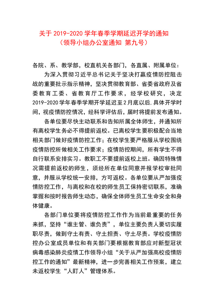 【疫情防控】关于2019-2020学年春季学期延迟开学的通知