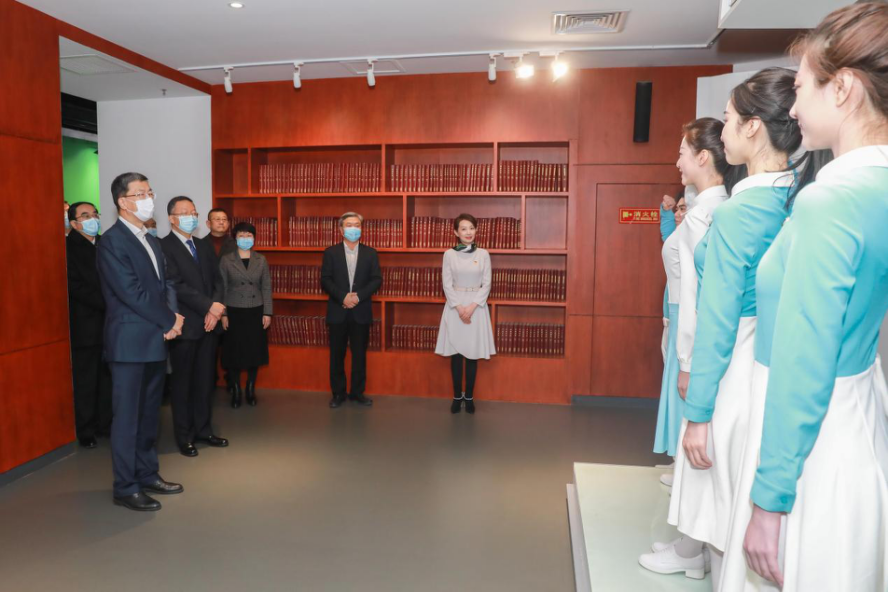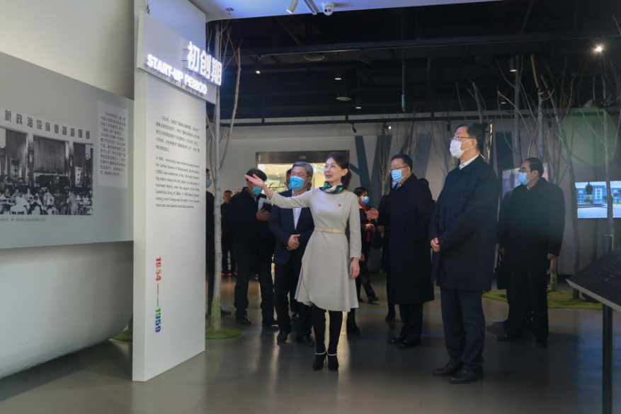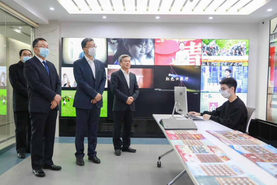在校史馆,庆祝中国共产党成立100周年大会广场献词团指导老师刘鹏、李立宏进行了讲解介绍,献词团领诵员冯琳、成员沈倩等重温了入校誓词,表达“忠诚党的新闻事业,肩负党的喉舌重任”的决心。怀进鹏部长与师生亲切交谈,勉励他们听党话、跟党走,唱响“请党放心、强国有我”的时代最强音。