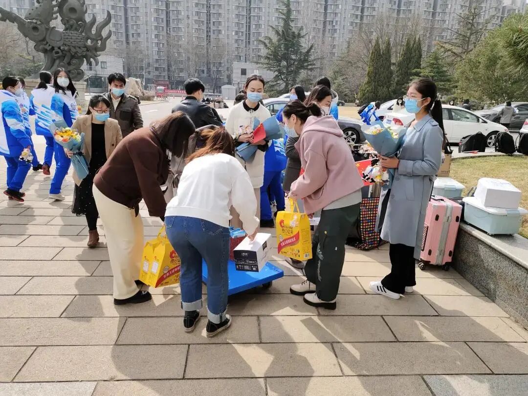 鲜花、水果、牛奶,来自学院的花式欢迎慰问品,让志愿者心里暖暖的。