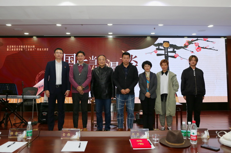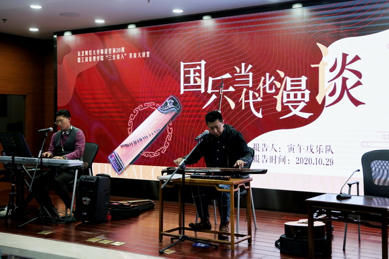 为贯彻落实习近平总书记关于教育的重要论述和全国教育大会精神,深入落实《中共中央办公厅 国务院办公厅关于全面加强和改进新时代学校美育工作的意见》,进一步强化学校美育育人功能,构建德智体美劳全面培养的教育体系,10月29日,我校在图书馆报告厅举办东北财经大学“师语堂”第26期暨工商管理学院“三全育人”美育大讲堂活动,邀请省级非物质文化遗产金州古琴传承人、东北财经大学客座教授姜伟老师和大连知名爵士钢琴演奏家西吾老师为我校师生作了题为《国乐当代化漫谈》的报告。工商管理学院党总支书记王玮、校团委副书记韩非、工商管理学院副院长陈文婷及学校师生200余人参加了活动。活动由韩非主持。