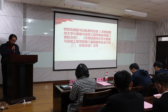 陈勇宣读《共青团贵州大学大数据与信息工程学院优秀部门表彰决定》和《共青团贵州大学大数据与信息工程学院第八届团学干部任命决定》,并由丁召和郭嫚分别向获奖部门和第七届团学干部颁发荣誉证书及聘书。