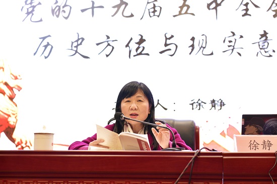 徐静围绕报告主题从四个方面进行阐述。一是从民族复兴的历史节点看十九届五中全会的历史方位,介绍了各个重要历史节点的历史发生时间、影响和任务。她指出,民族复兴的历史时间点对延续历史、开启未来有重大意义,学习党的十九届五中全会精神需要找准历史方位,从真正融合民族复兴历史的视角去探究,从民族历史发展的时间点、历史任务和影响去思考。二是从党的历史背景、目的和任务进行分析。她强调,认识党的历史是学习十九届五中全会精神的第一步,只有从党的历史背景开始学习,才能逐步了解党的十九届五中全会精神,认清党的十九届五中全会的历史方位。三是深刻认识十九届五中全会的重大意义。我国正处于实现中华民族伟大复兴的关键时期,要抓住机遇,为实现两个一百年奋斗目标,建成富强民主文明和谐美丽的现代化强国努力奋斗。四是做好学生思想政治建设及未来发展工作。她表示,青年学子要认真学习习近平新时代中国特色社会主义思想,不断以马克思列宁主义为指导、以社会主义核心价值观为引领,为自己的未来做好科学规划。
