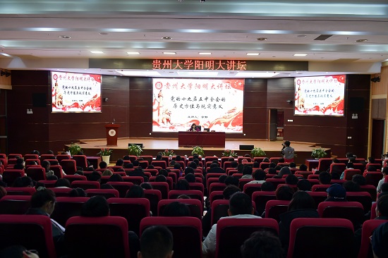 贵大新闻网讯12月16日下午,2020年第6期阳明大讲坛在我校西校区贤正楼报告厅举行,省委宣传部常务副部长、贵州省社科联主席徐静受邀作题为“党的十九届五中全会的历史方位与现实意义”的专题讲座。阳明学院党委书记余颖、院长张寒松、副院长廖敏及四百余名学生参加本次讲座。张寒松主持讲座。