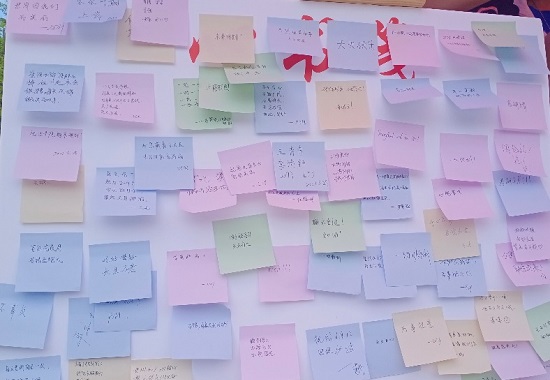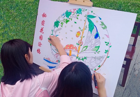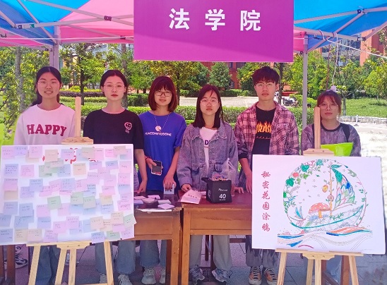 由法学院牵头主办的书写绘画环节包括“心书笺”“三行情诗”和“秘密花园涂鸦”三个项目。在“心书笺”活动中,同学们将自己在人际交往过程中的感受、某一阶段的心理体验与调节情绪的小建议一起写在便利贴上,以此释放自己、激励他人。他们还写下“三行情诗”,利用文字表达友善和关怀,用更加浪漫的方式传递温暖,并合作在 “秘密花园”进行涂鸦,通过在画布上涂满绚烂色彩,赶走灰霾,以此宣泄、释放紧张和焦虑的情绪。