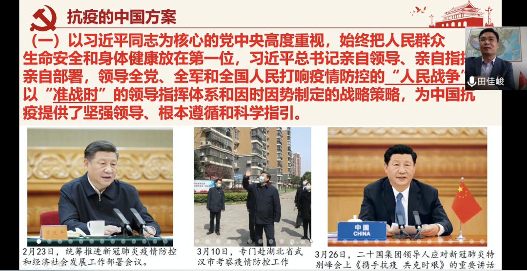 在课上,田佳俊书记带领同学们认识了新冠病毒,介绍了病毒可能的传播途径和理化特性,强调了如何从传染源控制和个人预防两方面做好有效的控制和预防,并举自身在疫情期间有规律的自我锻炼的例子来告诉同学们加强个人锻炼的重要性。此外,田佳俊书记还向同学们介绍了新冠疫情的全球防疫形势,从中美两国感染人数的数据对比,直观的体现了我国防疫措施的积极有效。同时介绍了中国抗疫方案的四个重要方面:以习总书记为核心的党中央直接领导;坚持紧紧依靠人民群众,把公众知情作为政府与民众沟通和形成共识的前提;发挥制度优势,高效配置资源;进行灵活人性化的社会管控以及以传统隔离方式为主的非医疗干预。在介绍完全球抗疫的现状后,他与同学们分享了“全球抗疫的中国担当”的视频,视频以过去大流行病背后的真实原因和当时舆论的对比为主,有效的揭露了当下个别西方媒体将新冠病毒流行的责任归咎于中国这一错误的思想。在课程的最后,田佳俊也向同学们介绍了我校在疫情期间有力的抗疫工作和安排。