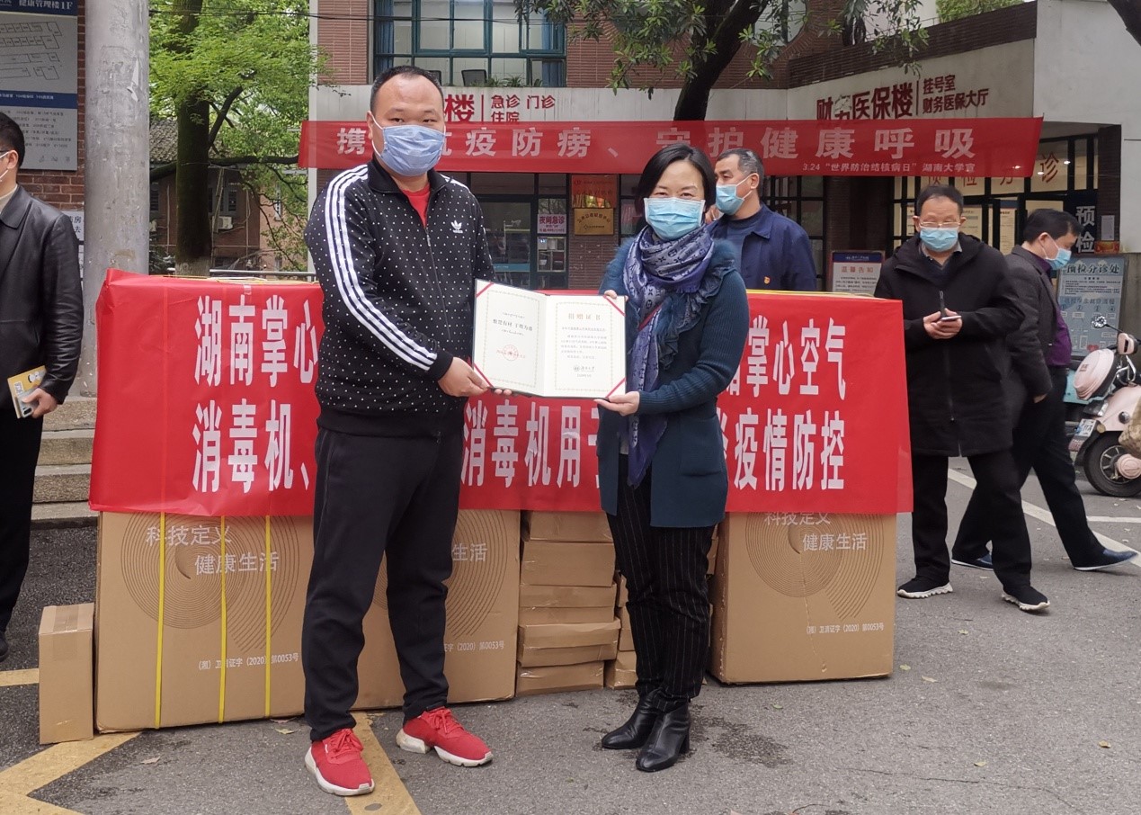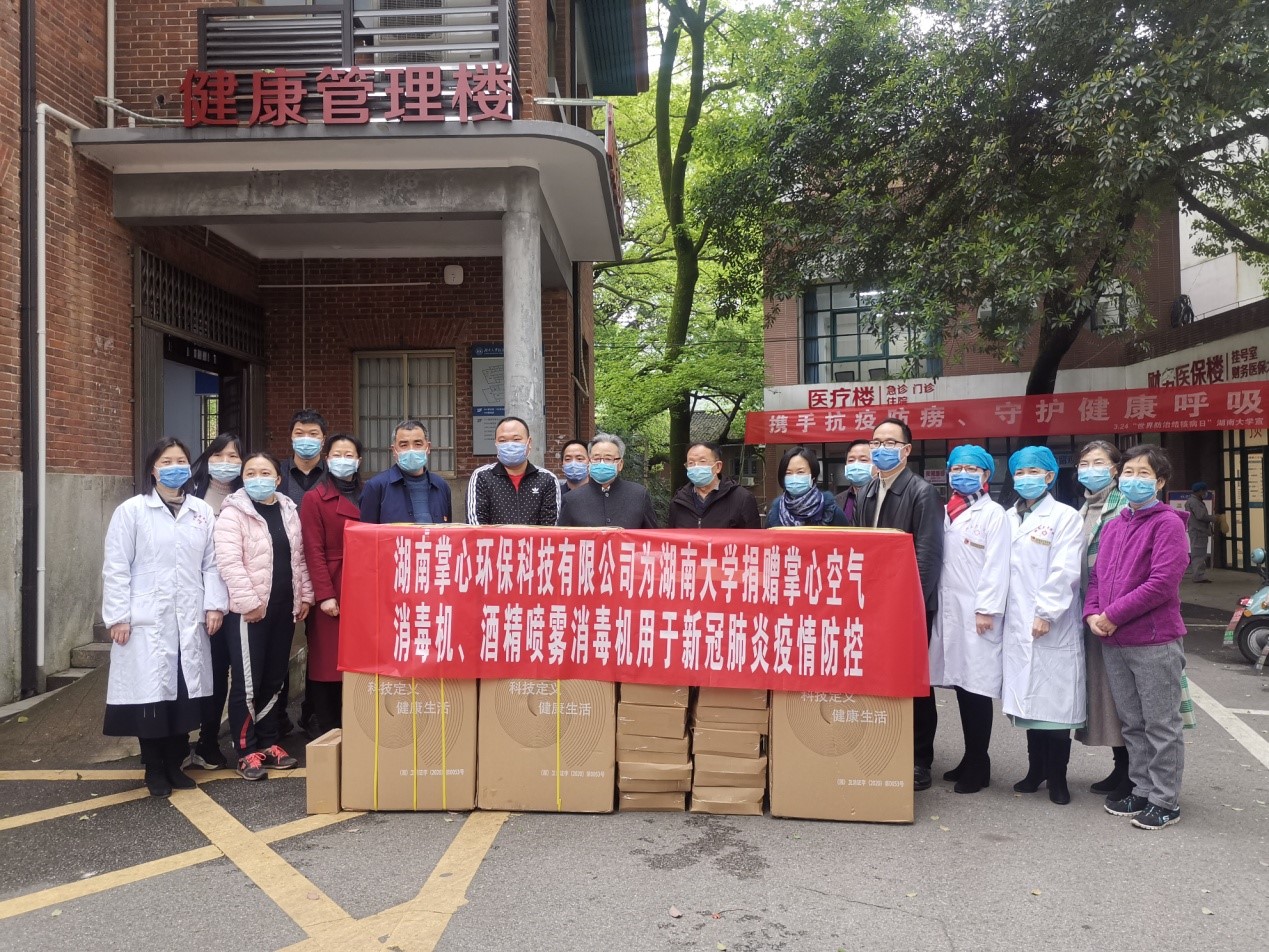 4月1日,湖南掌心环保科技有限公司向湖南大学捐赠3台空气消毒机、6台酒精喷雾机,支持学校新型冠状肺炎疫情防控工作。