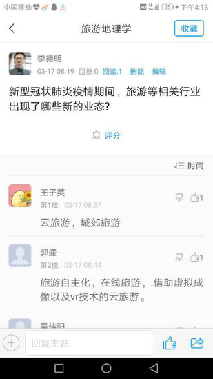 针对线上课程教学高峰时期网络拥挤这一问题,该院院长朱国兴、教师朱升东和方敦礼一致认为应“采用灵活的教学时间”,在规定的上课时间发布签到,布置本次上课章节,任务点在一周内完成即可。方敦礼提出一门课由3-4位老师合上,每周每门课抛出一个爆点专题来吸引学生。余向洋、甘卓亭和姚婷老师的《旅游研究方法》课程便采用了这一形式,实现了教学资源的共建与共享。