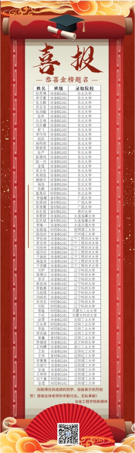 2020年全国高等院校硕士研究生招生录取工作已经落下帷幕,冶金学子捷报频传,我院学生共考取研究生65人,占毕业生29%,占全校考研录取人数30%,其中考入东北大学、大连海事大学、广西大学、贵州大学等985、211院校的学生占总录取院校学生的44.6%,冶金考研团队再次续写辉煌。