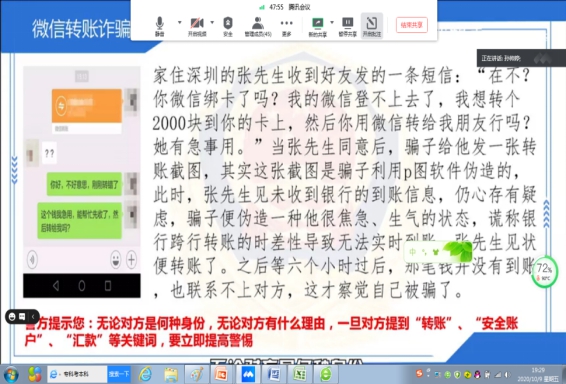 随着科技信息的发达,犯罪分子的诈骗手段越来越多,诈骗手法不断升级,花样推陈出新,电信网络诈骗的案件不断高发。在学校及院系的高度重视下,各班班主任就相关反诈知识对学生进行教育,此次班会分线上、线下双形式展开。