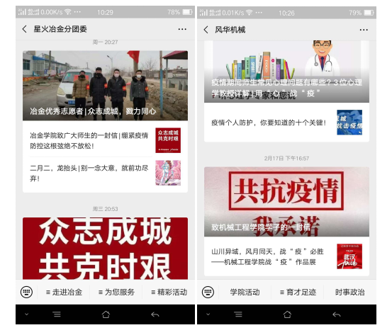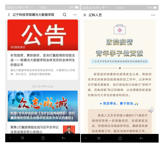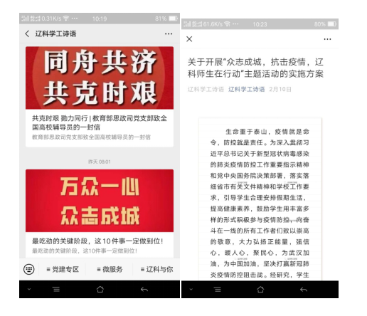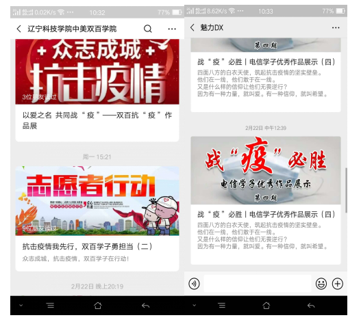 抗击疫情,思想稳定是关键。为引导学生理性看待疫情,在疫情中坚定信念,担负社会责任,学生工作处通过学工诗雨微信公众平台、学生工作微信群、易班客户端、学生工作QQ群等多种形式和渠道,积极发布疫情防控相关推送文章,转发权威媒体的疫情防控信息,对疫情防控科普知识进行宣传普及,及时跟进传达学校各项工作部署。同时,从“学、思、行”三方面精心设计,组织开展“众志成城,抗击疫情,辽科师生在行动”线上主题活动,引导广大学生在疫情期间开展一次答题谱知识、一篇征文表决心、一个视频秀守家、一副头像送祝福等活动,大力弘扬正能量,用实际行动助力打赢这场疫情防控战。各院系也充分利用本院系的微信公众号、班级微信群、QQ群向学生发送防疫知识、转发官方权威信息,号召同学们理性看待疫情,科学学习防疫知识,一切行动听指挥,不造谣、不信谣、不传谣,同时及时宣传学生抗疫作品和参与抗疫的学生榜样,坚定学生抗疫信念,引导学生思考疫情中的英雄和英雄故事,在能力范围内以实际行动践行了当代大学生的责任担当。学生工作队伍通过开展各类教育宣传活动,利用疫期对学生进行价值引领,筑牢了学生抗疫战场的第三道思想防线。