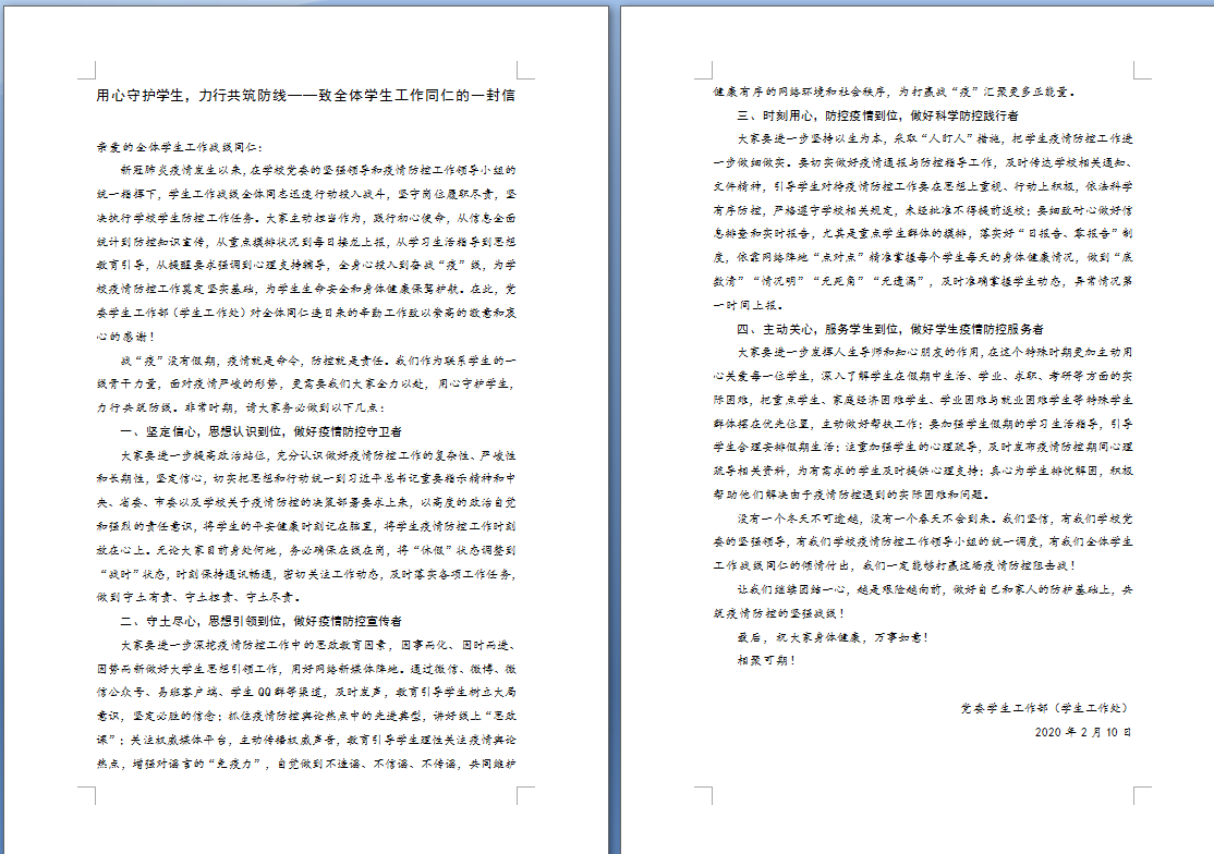 疫情就是命令,防控就是责任。新冠肺炎疫情发生以来,我校学生工作队伍认真贯彻落实上级疫情防控决策部署,坚决执行学校防控工作的任务要求,把学生生命安全和身心健康放在第一位,众志成城、积极作为、多措并举筑牢“四道防线”,扎实推进学生疫情防控和思想政治教育工作,以实际行动践行使命担当。