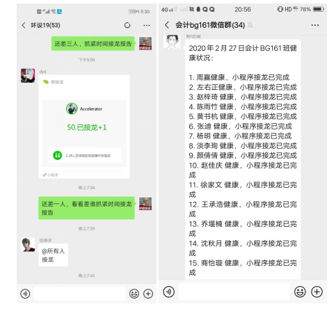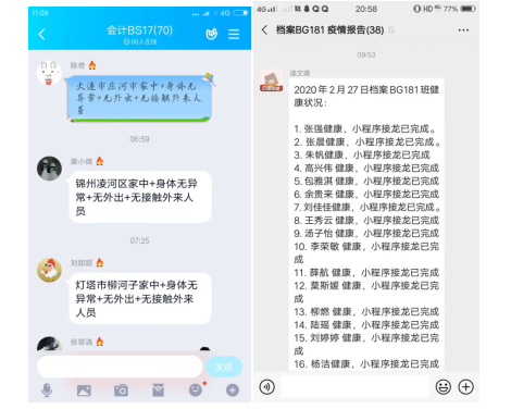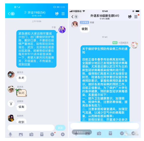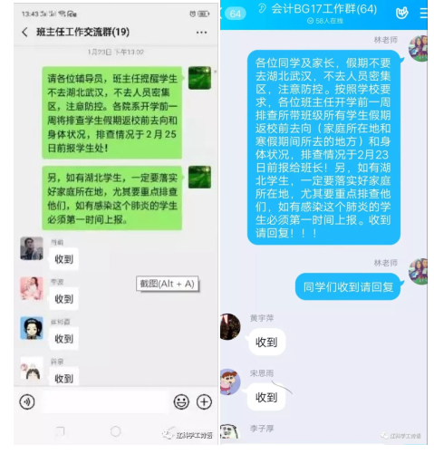 学生的生命安全和身体健康是学校最关心的问题,也是抗疫期学生工作队伍最重要的使命!全体学工人员每天保持24小时手机畅通,充分利用网络资源,每天把防控疫情的微信群、QQ群置顶,“键对键” “屏对屏”,时刻关注和提醒每一个学生关注自己的身体情况,做好隔离和防护,每天“接龙报平安” ,全力做好学生健康动态监测工作。同时,严格执行学生疫情防控“日报告、零报告”制度,利用微信接龙程序,使用定位功能对全校10167名学生生开展“ 一对一”、“点对点”全面精准摸排,对17名身处湖北的学生实施重点关注。对接触病例史学生、身体有发热症状的学生和跨市出行的三类学生建立动态监测。他们掌握每一名学生的健康状况和思想状态,做到情况明、数据准,并逐项逐层配合好,不瞒报、不漏报,筑牢了学生抗疫战场的第二道安全防线。