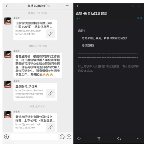 主动开展线上服务。疫情期间就业信息网主要通过“校园双选会”(红色)与“招聘信息”(蓝色)两个菜单栏发送招聘信息。红色偏向于工科专业,蓝色偏向于文科专业。学院第一时间传达就业信息网上各级各类关于疫情防控期间就业工作相关文件、通知等,便于毕业生及时全面了解情况,主动应对。