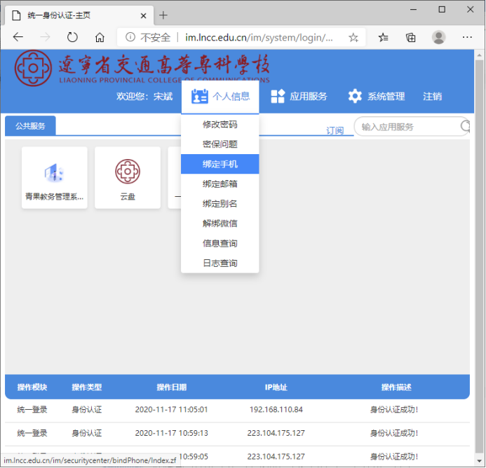 登录后选择“个人信息”→“绑定手机”