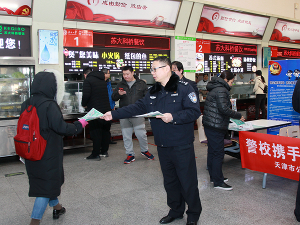 本次活动主题为“警校携手联动,防诈情暖校园”,来自天津市公安局经保总队、天津市通讯管理局、中国银联、工商银行、建设银行和南开大学保卫处的工作人员,在二食堂通过发放宣传资料、现场答疑等方式,开展宣传咨询。