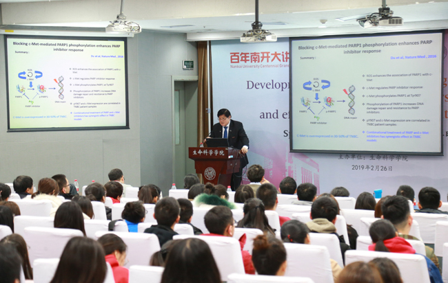当天,洪明奇教授还做客“百年南开大讲坛”,以标记物引导的靶向治疗,PARP,EGFR和c-Met抑制剂以及有效的免疫检查点治疗的发展为题,结合自己的实验研究为南开师生作了学术报告。生命科学学院负责人主持报告会,学院学术骨干、学生200余人参加。