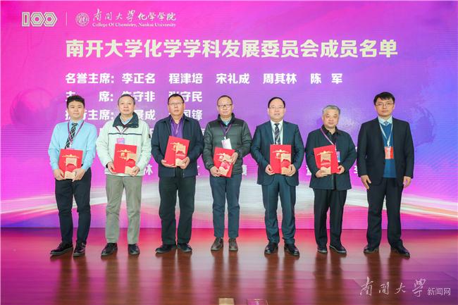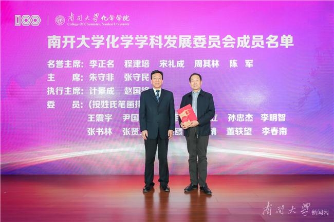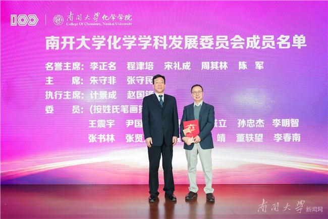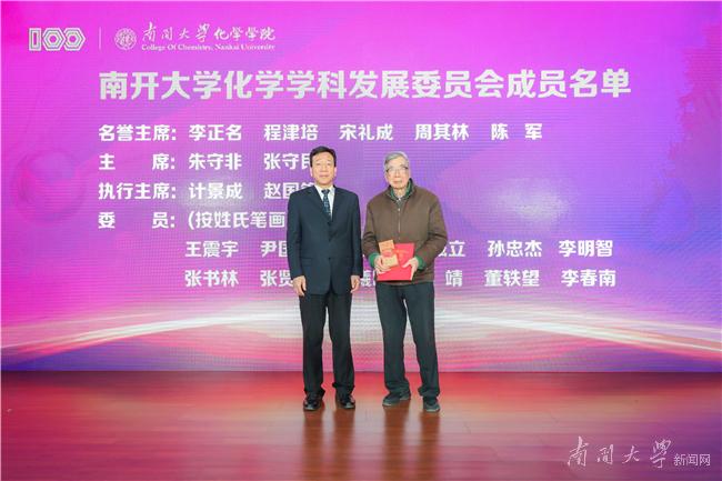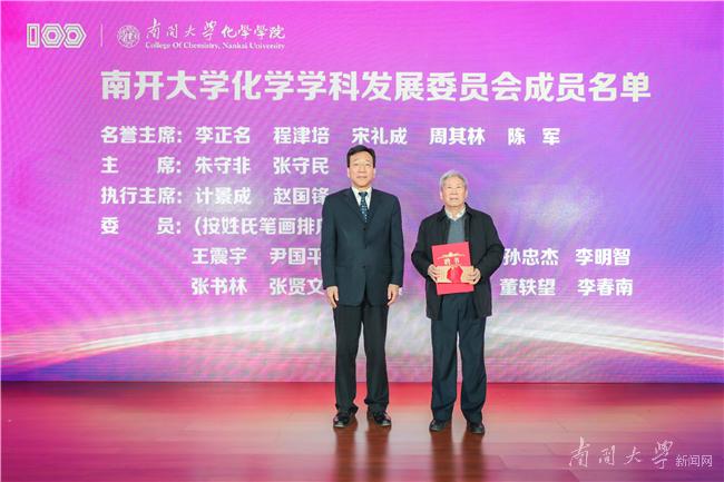 为了进一步凝聚师生、校友、企业力量,更好的支持推动南开化学攀登计划,化学学院成立了南开大学化学学科发展委员会,委员会包括名誉主席5人、主席2人、执行主席2人、委员12人。李正名、程津培、宋礼成、周其林及中国科学院院士、南开大学副校长陈军等5位院士受聘为名誉主席,杨庆山向他们颁发聘书。