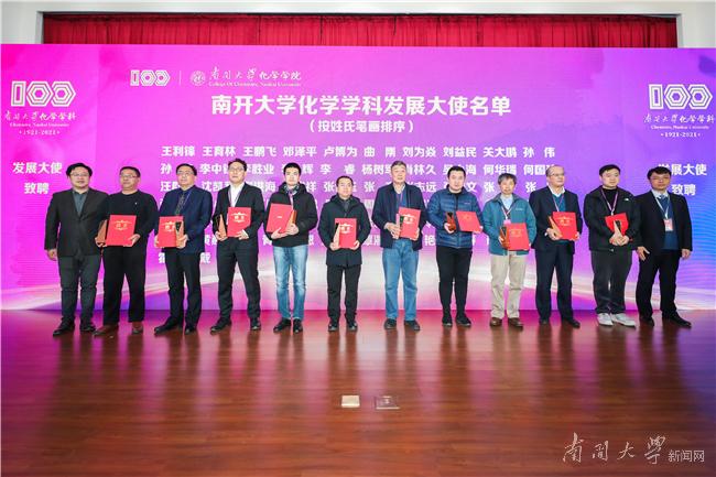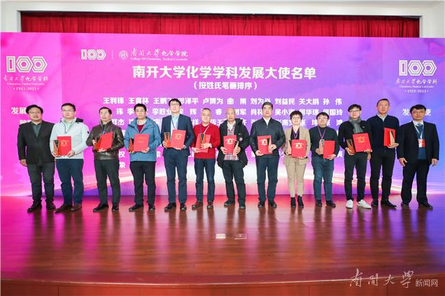 为了更广泛地凝聚发展合力,62名南开校友企业家代表受聘为南开大学化学学科发展大使,我校教育基金会、化学学院负责人向校友企业家代表颁发聘书。