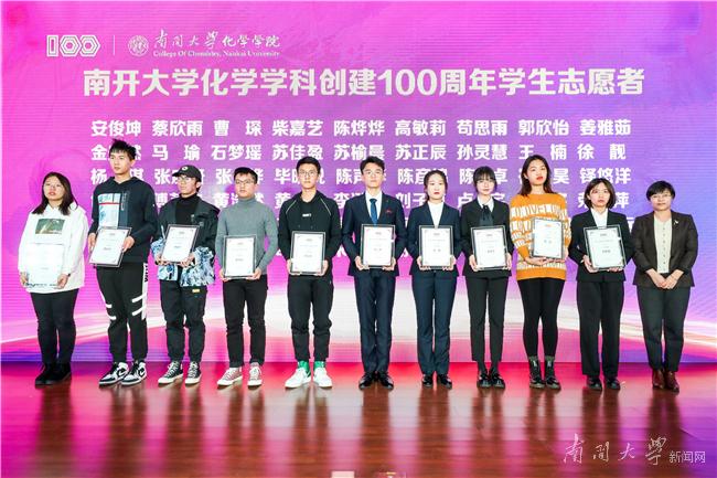 南开化学,百年荣耀。化学学院有关负责人向51名学生志愿者颁发了南开大学化学学科创建100周年志愿者证书。