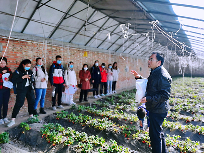 在有机草莓种植大棚里,阮维斌教授从食品安全、乡村振兴、助人精神三个角度介绍了病虫害生物防治工作。针对草莓最常见的害虫蛞蝓和蜗牛,阮维斌教授团队研制的生物食诱剂既能保证消费者吃到嘴里的草莓是安全的,也能降低病虫害导致的损失,实现农民的增收,大大优于传统的化学防治技术。同时,阮维斌教授也谈到了生物防治技术的未来。很多领域需要原创技术,比如在农药降解菌、重金属如何富集在非食用部分,生物防治技术还有无限前景。阮维斌教授通过自己扎根农村的经历鼓励同学们,针对农村存在的社会问题,能为新农村建设发出南开的声音,是一件非常好的事,要有充分的耐心去做一件事情,激发内心的光明,不求回报。