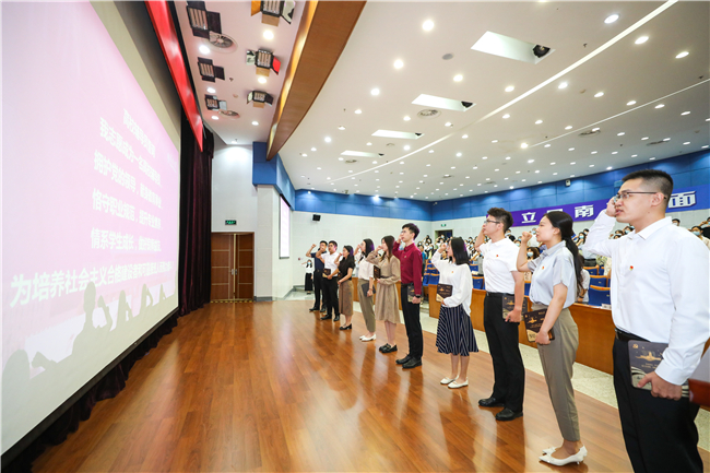 “我志愿成为一名高校辅导员,拥护党的领导,献身教育事业,恪守职业规范,提升专业素养,情系学生成长,做好良师益友。为培养社会主义合格建设者和可靠接班人而努力奋斗!”在2020年南开大学十佳辅导员贾盛的带领下,新入职辅导员与全体学工干部一同重温了高校辅导员誓词。