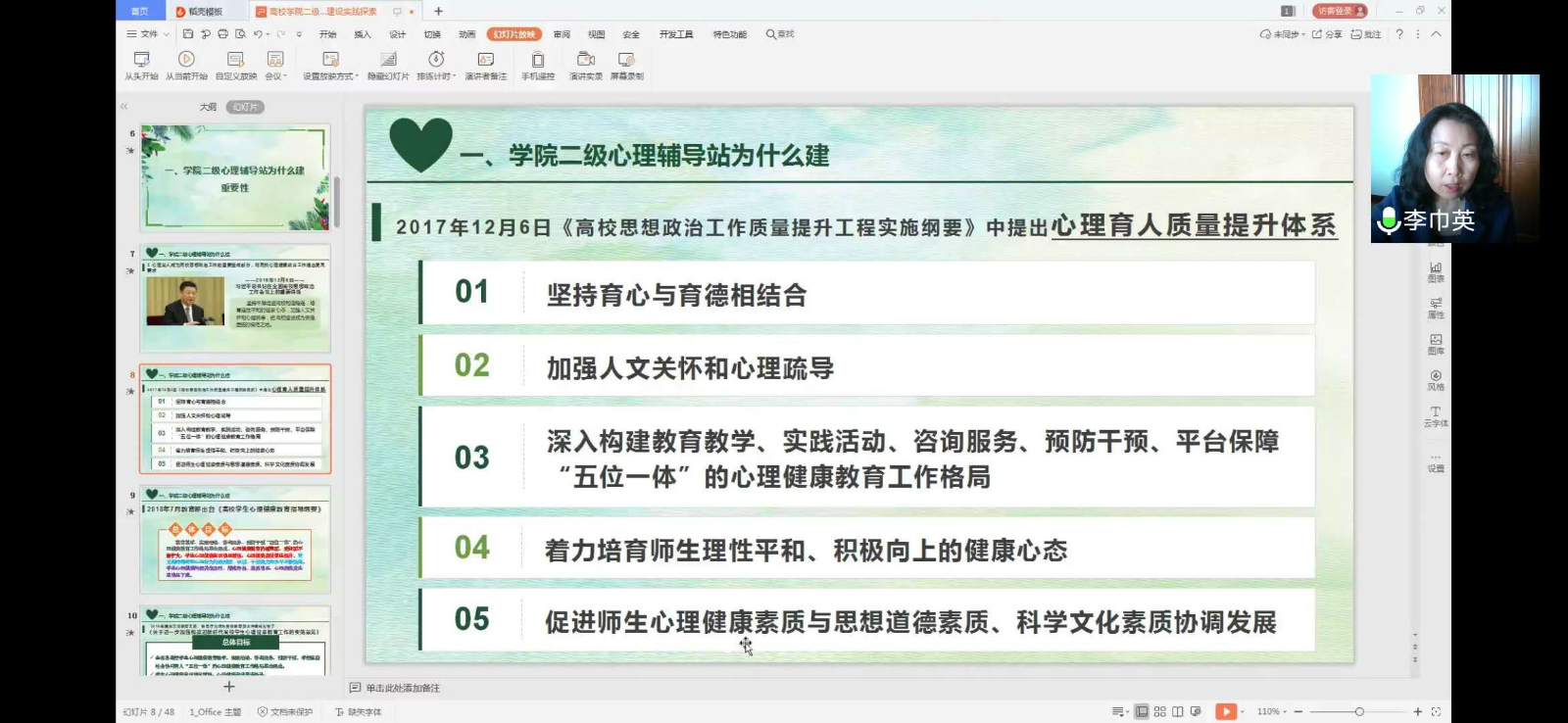 李巾英老师沿着学院二级心理辅导站“为什么建设”“怎么建设”“如何建设”的逻辑理路,结合黑龙江大学的建设经验,分别介绍了学院二级心理辅导站建设的重要性、以及如何实现标准化建设和拓展工作途径。培训过后,李老师还与个别辅导员进行了线上交流,我校学生思政工作干部纷纷表示:他山之石,可以攻玉,本次培训内容兼具指导性和创新性,对各学院开展此项工作具有很强的借鉴意义。
