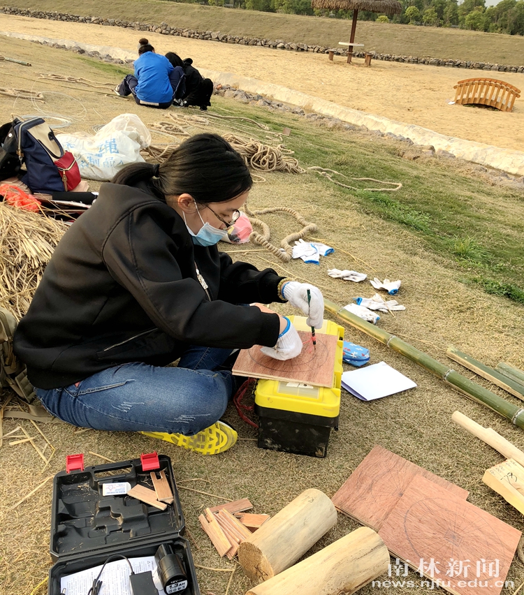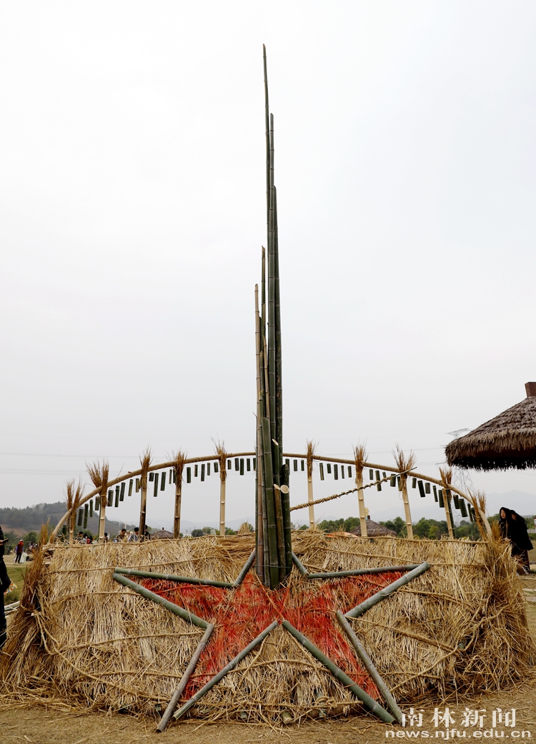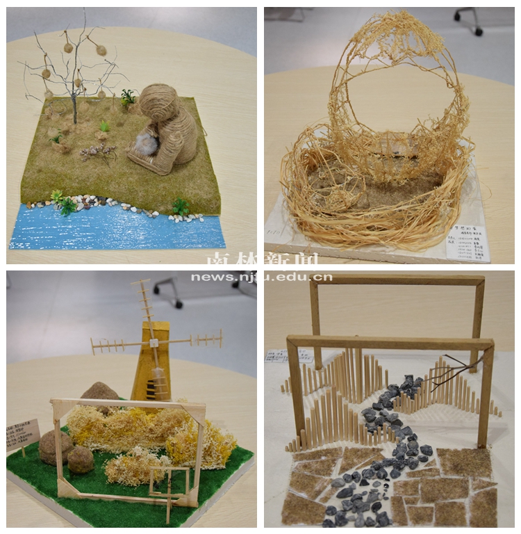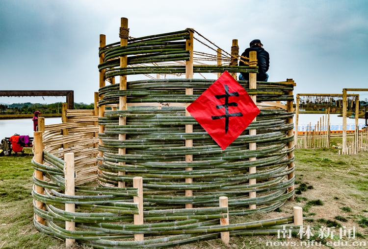 切竹竿、劈竹篾、钻圆孔、打榫卯、绑铁丝、搓麻绳……在南林学子的精巧构思和制作下,原本被废弃凌乱、粗糙的稻草,逆袭“变身”为一个个大气、优美的景观小品,每组作品的设计和布局都与园区内原有的自然景观完美融合,吸引不少游客驻足观赏。
