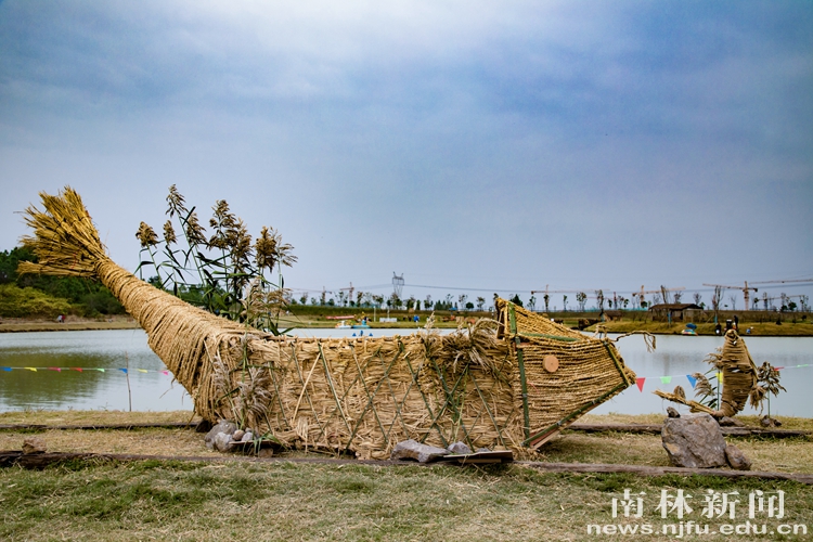 【南林新闻中心讯】稻黄撩人醉,处处丰收景。这两日,南京江宁区溪田生态农业园内多了一群新景观:瞧!这条以竹木为骨,稻草为鳞的“大锦鲤”正跃出水面;再看这边,舞杆弄桅、乘风踏浪,一艘满载梦想的“希望之船”扬帆起航……
