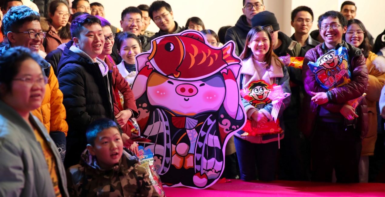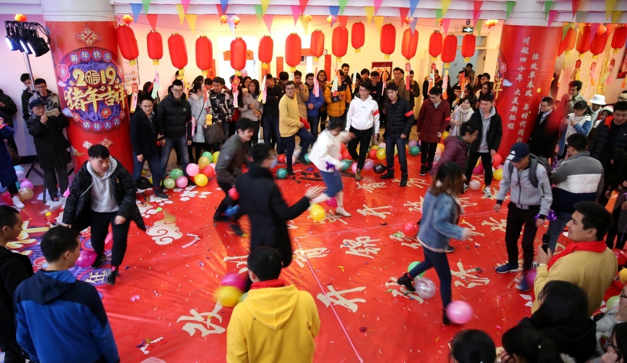 “美女与野兽”、“欢乐爆爆爆”、“齐心协力”、“击鼓传金猪”等集体游戏让在场同学进入欢乐海洋,穿插其中的三轮抽奖一次次把现场推向高潮,兔子舞、拍手舞,让每位同学都在为2019年的自己而起舞。