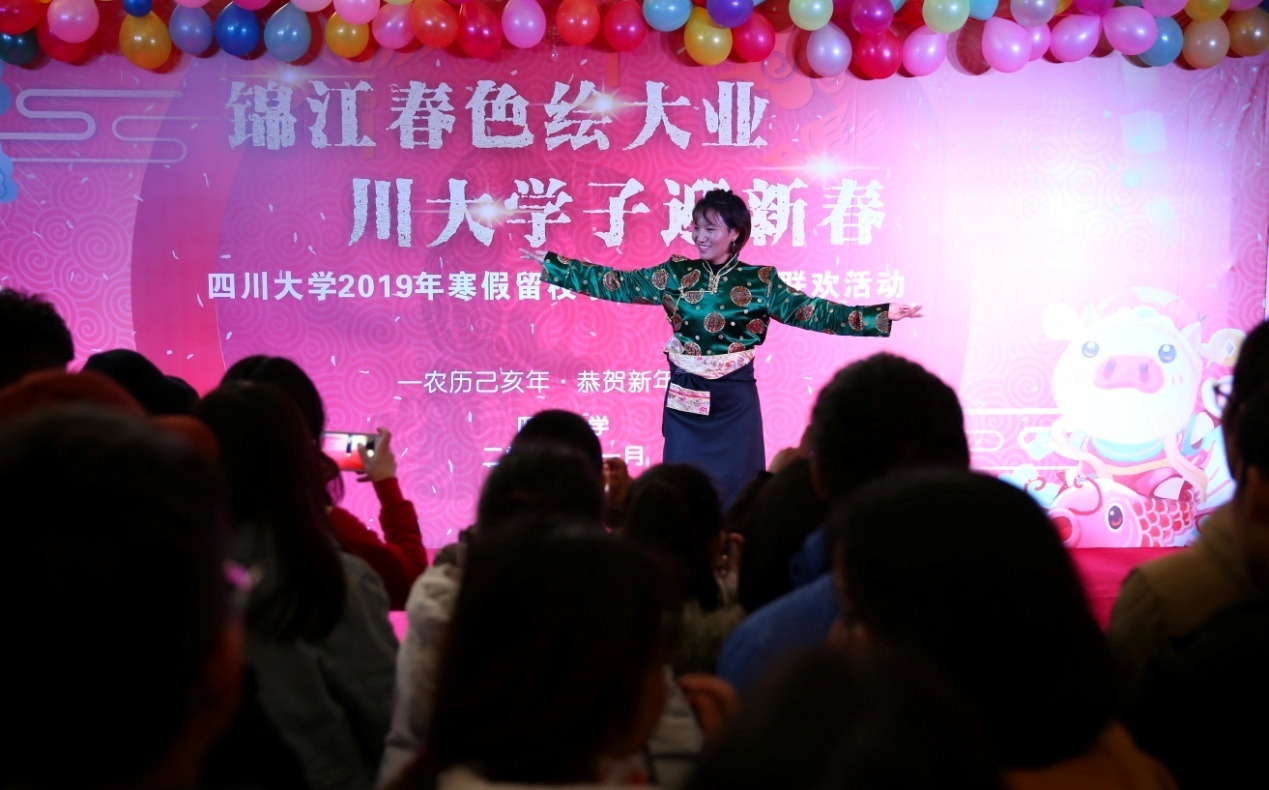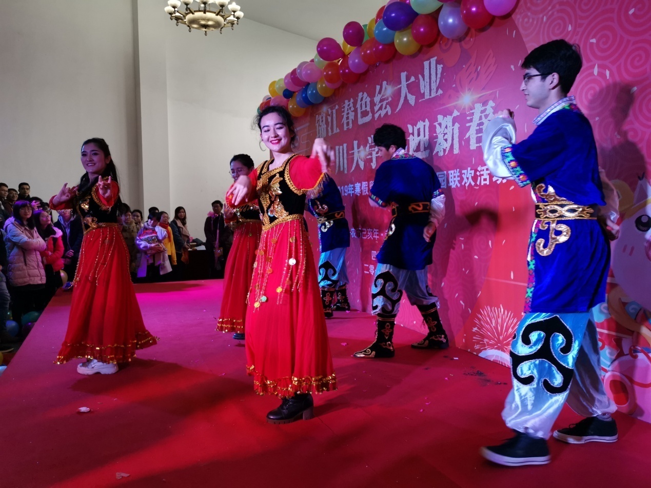 随后,一段融合哈萨克族、彝族、藏族和维吾尔族的舞蹈串烧,展现了中华盛世下的民族大团结;努尔江同学的一曲《我们的青春》,带起台下师生的热舞;韩燕琳同学一支小提琴独奏《茉莉花》让同学们沉静在悠扬的乐曲中;刘稚与李萌月同学合唱的《恭喜发财》让全场再次进入了新年气氛的高潮中……现场所有同学都成为川大年的重要元素。