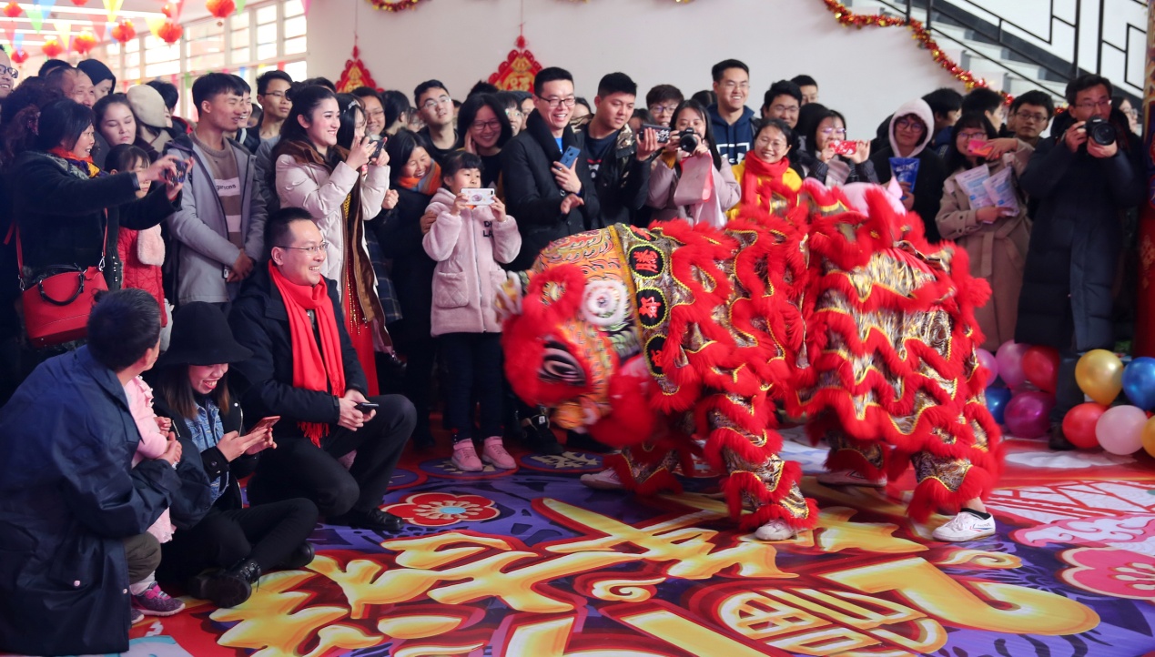 在欢声笑语中,10名同学在专业老师的指导下玩起了龙灯,18米长的巨龙在龙珠的带领下伴随着锣鼓声忽上忽下,忽左忽右,时而翻滚,时而腾飞,从文华活动中心门口串入大厅……“你方唱罢,我登场”,紧随舞龙之后,两头巨狮经过点睛后从沉睡中惊醒,摇头摆尾、仰视低顾、探测方向……伴随着锣鼓音乐,被誉为神兽的两头狮子展现了“慑服百兽”的威力,尽显刚健有为、自强不息的奋斗精神。