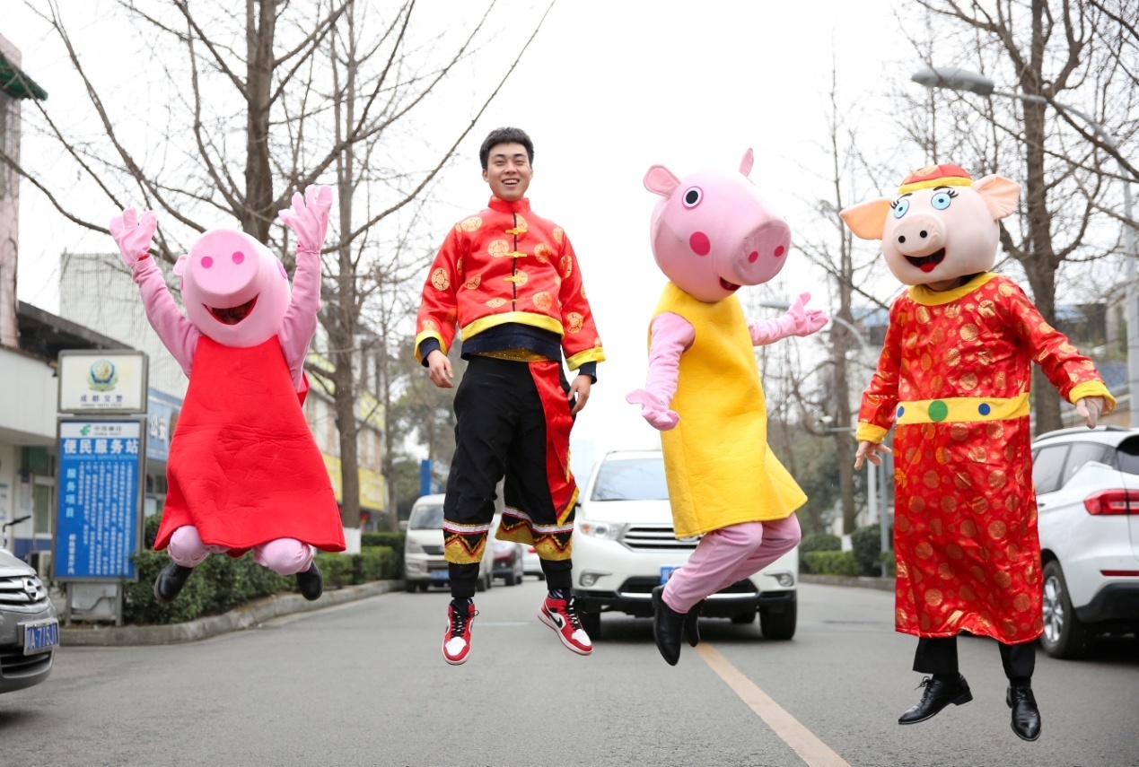 “小事从不在乎,大事从不糊涂,我是一只聪明的快乐的小猪……”,资助中心全体老师着靓丽的黄色衣服,戴大红围巾,跳起了《小猪舞》,展现出认真工作外可爱的一面,祝福同学们在猪年拥有小猪的乐观快乐。