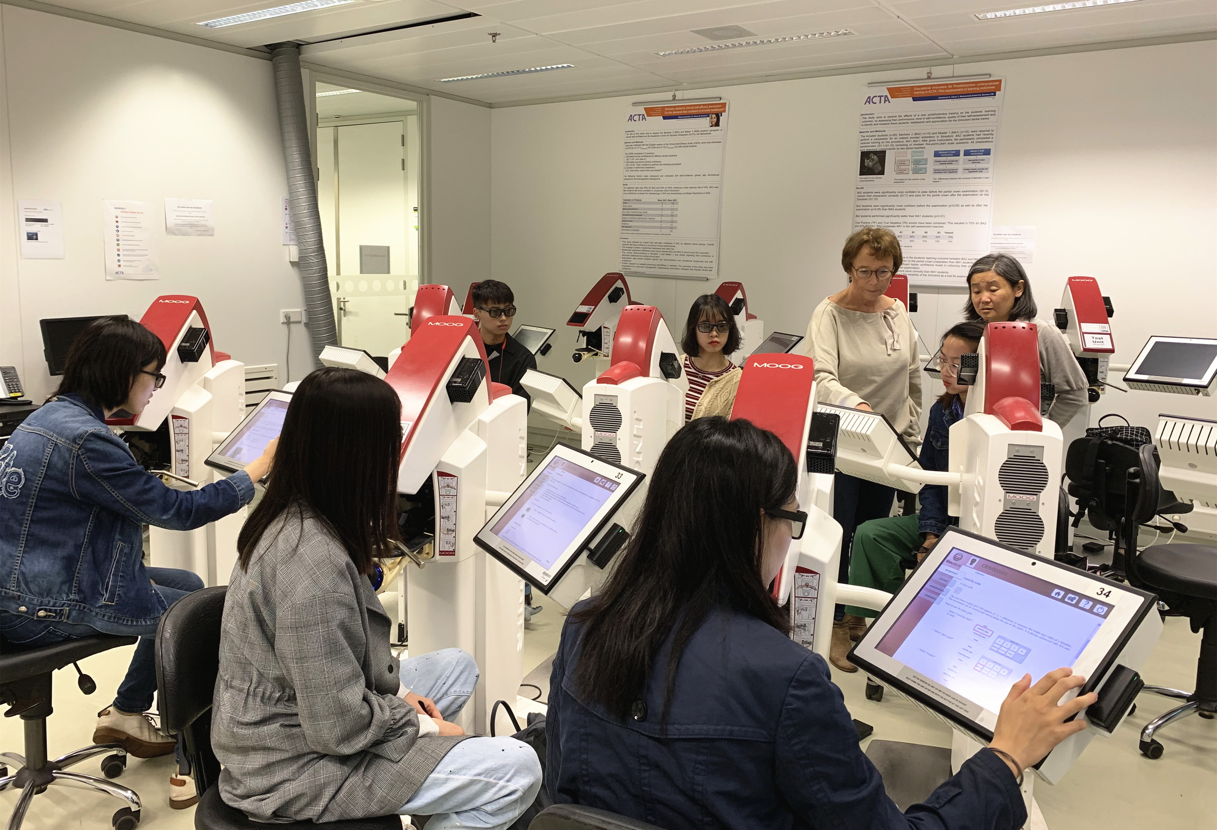 而最让同学们感兴趣的便是ACTA的SIMODONT虚拟仿真实验室。SIMODONT是由ACTA及美国MOOG公司共同研发的一款针对口腔医学生手部技能训练的虚拟仿真训练机,我院陆续引进并应用于教学中。因此,在这里进行手部训练对同学们来说并不陌生。而J.M. Vervoorn教授也积极倾听同学们对于该仪器的建议和想法,并介绍了ACTA正在研发的新仪器。