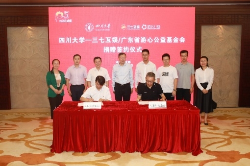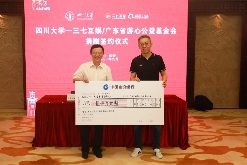 李卫伟董事长和学校教育基金会荣建国秘书长分别代表校企双方签署《四川大学——三七互娱/广东省游心公益基金会捐赠协议》。