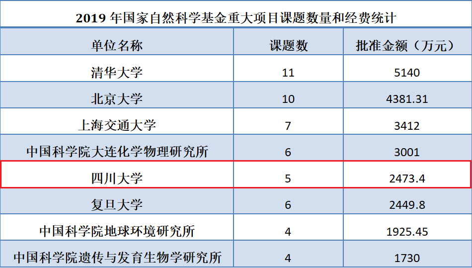 2019年国家自然科学基金重大项目公布 川大表现不俗