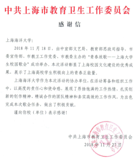 中共上海市教育卫生工作委员会在感谢信中感谢我校作为协办“青春放歌——上海大学生校园歌会”的单位,以高度的责任心和使命感,展现了昂扬饱满的工作热情、扎实创新的创作精神、精诚合作的团队精神和务实高效的工作作风。从2018年10月24日接到演出任务以来,经过选拔,来自舞蹈、合唱、管弦、民乐、主持、戏剧、武术团的220余名艺术团团员马不停蹄投入到排练中,主要参演歌舞《我们的故事》和合唱《追光者》两个节目。