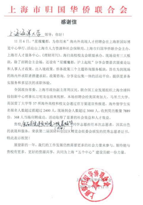 上海归国华侨联合会在感谢信中提到我校食品学院2015级学生袁韫华在11月6日“行璨魔都,为你而来“海外高端人才招聘会的中担任志愿者,凭借出色的表现和服务,荣获第二届国际科创园区波看会组委会颁发的优秀志愿者证书。袁韫华认为,自己以大学生的身份参加了星璨魔都海内外高端人才招聘会志愿者,感到受益匪浅。在服务企业、服务应聘者的过程中,他也较好地了解到就业市场,同时也在这一过程中将“勤朴忠实”的校训精神在志愿中传承和发扬。