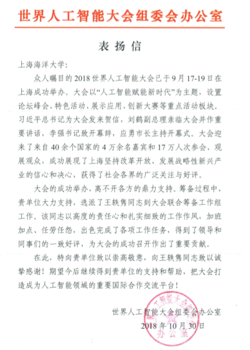 近日,我校分别收到来自中共上海市教育卫生工作委员会和上海市归国华侨联合会的感谢信、世界人工智能大会组委会办公室的表扬信。
