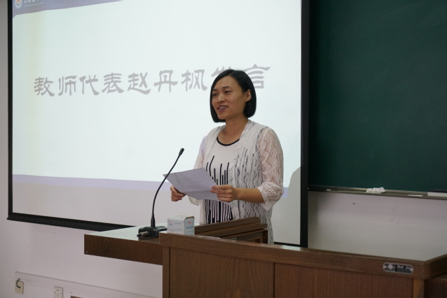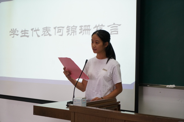 预科生教师代表赵丹枫用诙谐的语言鼓励大家积极主动适应新的学习环境,全面提升自身的素养,并建议大家在学习和生活中从小事做起,学会做人、做事,用信心、勇气和毅力做好预科阶段的学习。