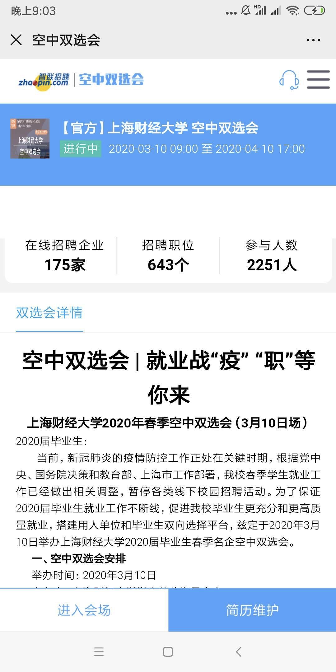 同样是昨日,上海财经大学的“空中双选会”吸引了2251人,1590名学生在线投递了12410份简历。疫情影响下,“云宣讲”“云面试”一场接一场,各高校联合企业、招聘平台为毕业生在家求职提供积极渠道。