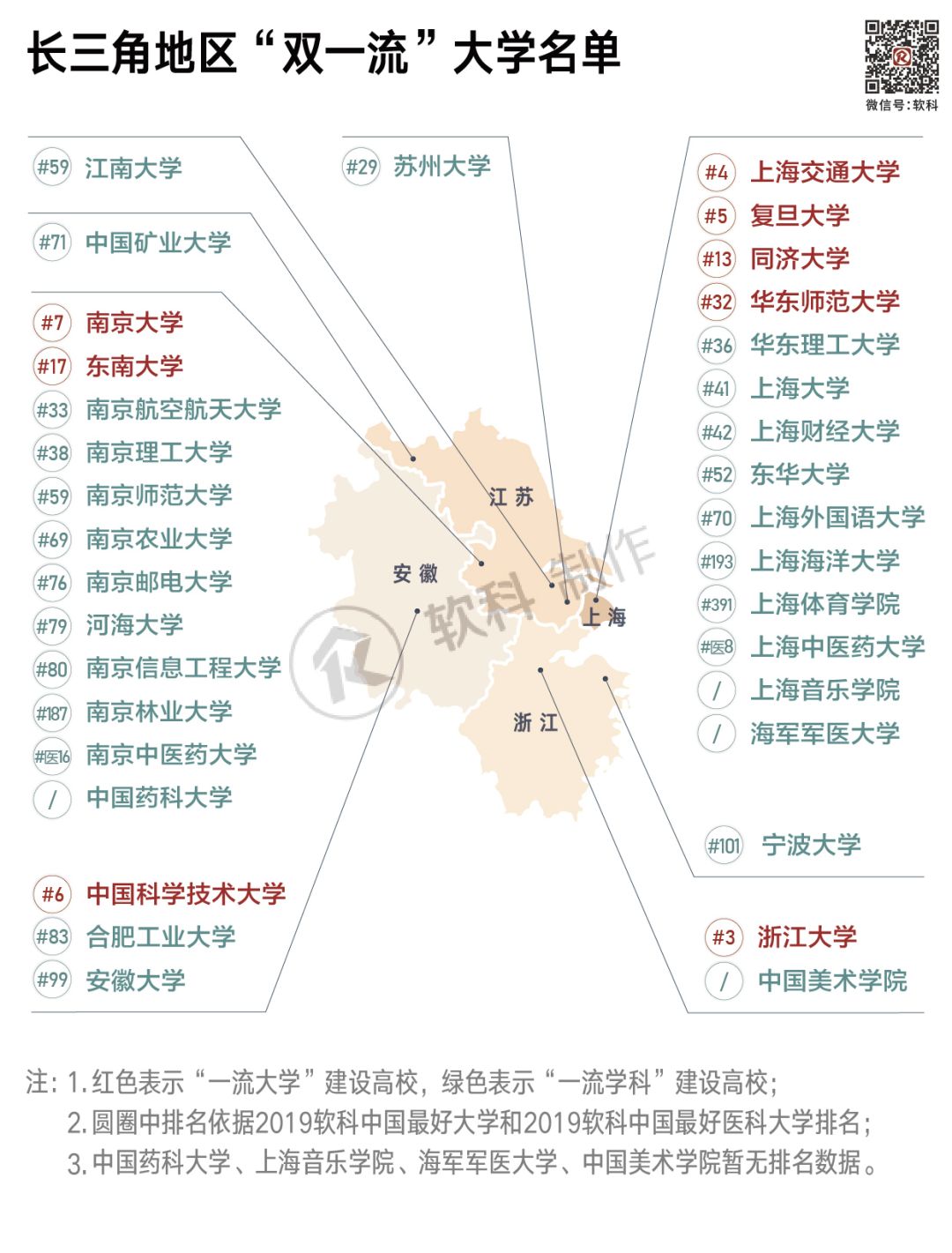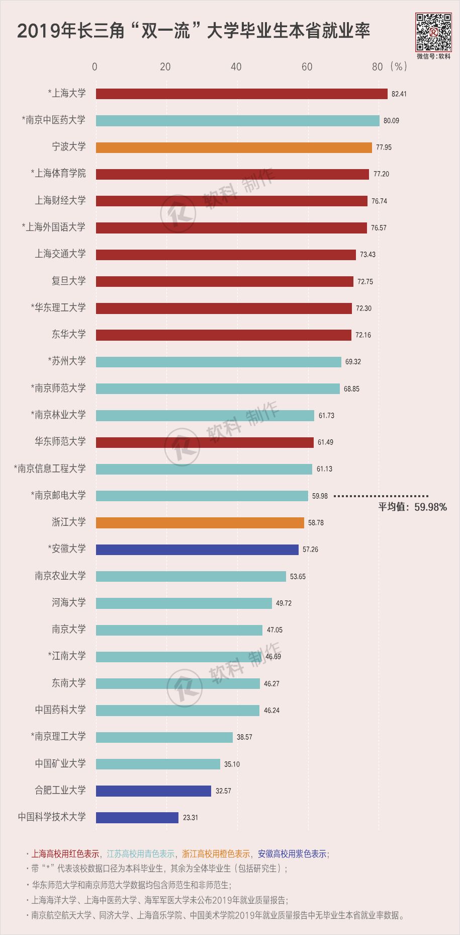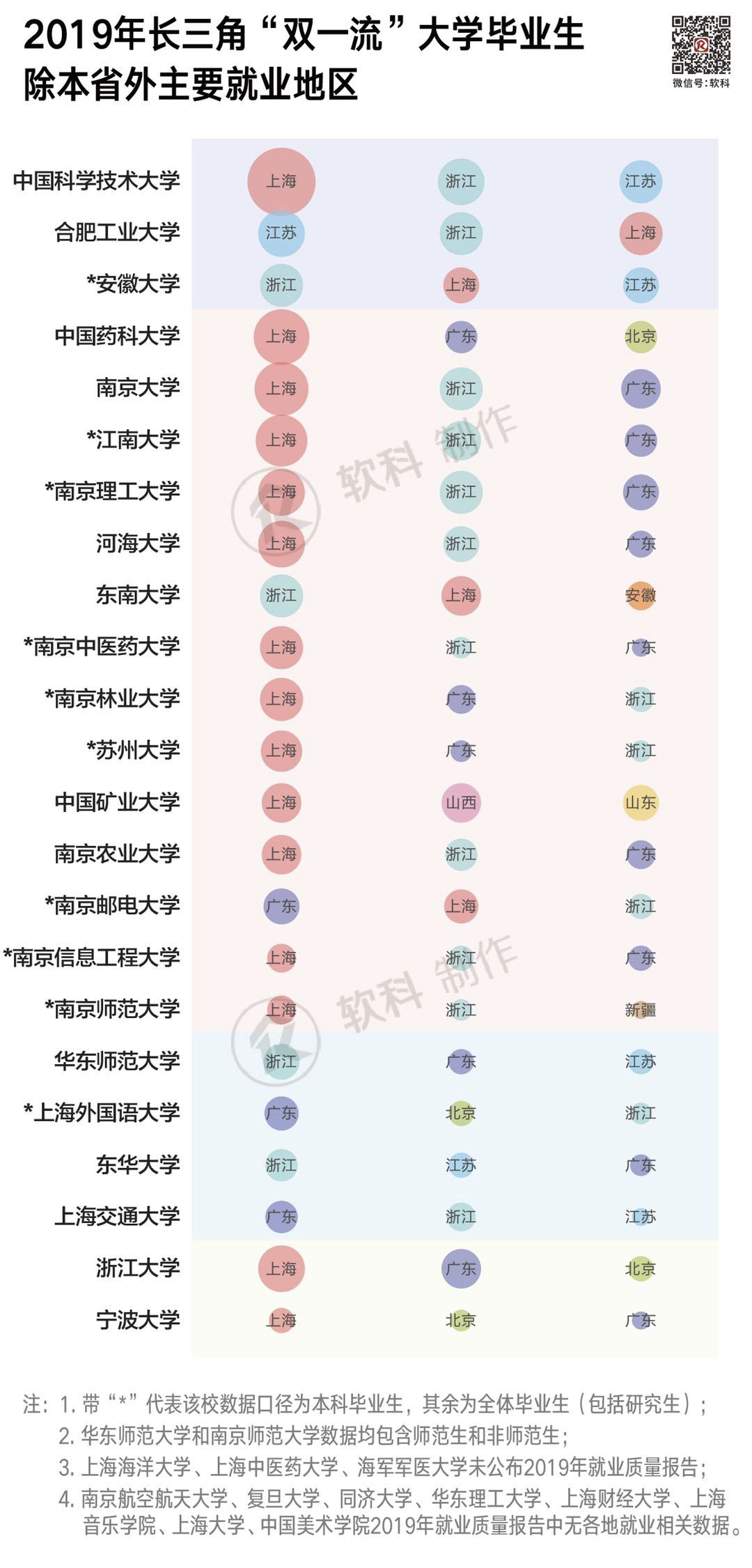 软科高教观察员陆若云分析发现,上海高校毕业生留沪就业意愿最强,9所有本省就业数据的学校中,8所在70%以上,平均值达74.47%;江苏15所“双一流”高校留苏率在35%-80%不等;浙江省“双一流”虽少,但留杭意愿均较强烈,浙江大学毕业生省内就业率58.78%,其中82.34%流向杭州,6.33%流向宁波;相比之下,安徽省“双一流”毕业生留皖意愿较弱,安徽大学本科毕业生本省就业率57.26%,合肥工业大学为32.57%,中国科学技术大学留皖的毕业生才占2成左右,流向上海的毕业生有21.03%,流向浙、苏的人数共占20%多。