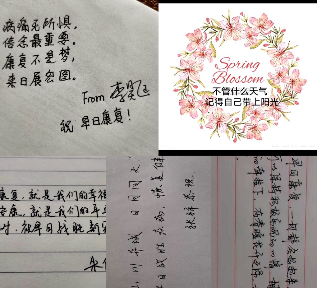 “病毒无所惧,信念最重要。康复不是梦,来日展宏图。”“凡是不能击垮我们的都会使我们更强大!”“不管什么天气,记得带上阳光”……当看到党员同学们充满深情厚谊的小卡片和自制小视频时,小A感言道:“本来每天吃6种药,很难吃,很烦躁,但今天感觉阳光明媚。”“入党入得真值!”