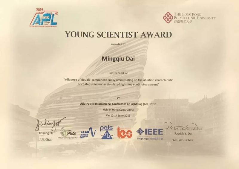 近日,第11届亚太雷电国际会议(The 11th Asia-Pacific International Conference on Lightning, APL2019)在香港召开。上海交通大学电子信息与电气工程学院电气系傅正财教授课题组的博士生戴明秋在本次大会上荣获青年科学家奖(Young Scientist Award)。获奖论文题目为“Influence of double-component epoxy resin coating on the ablation characteristic and process of coated steel under simulated lightning continuing current”。