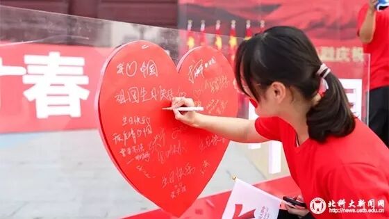 北科大在五环广场举行盛大的升国旗仪式。学生挥舞手中的国旗同唱国歌,并在爱心板上写下对祖国的祝福。