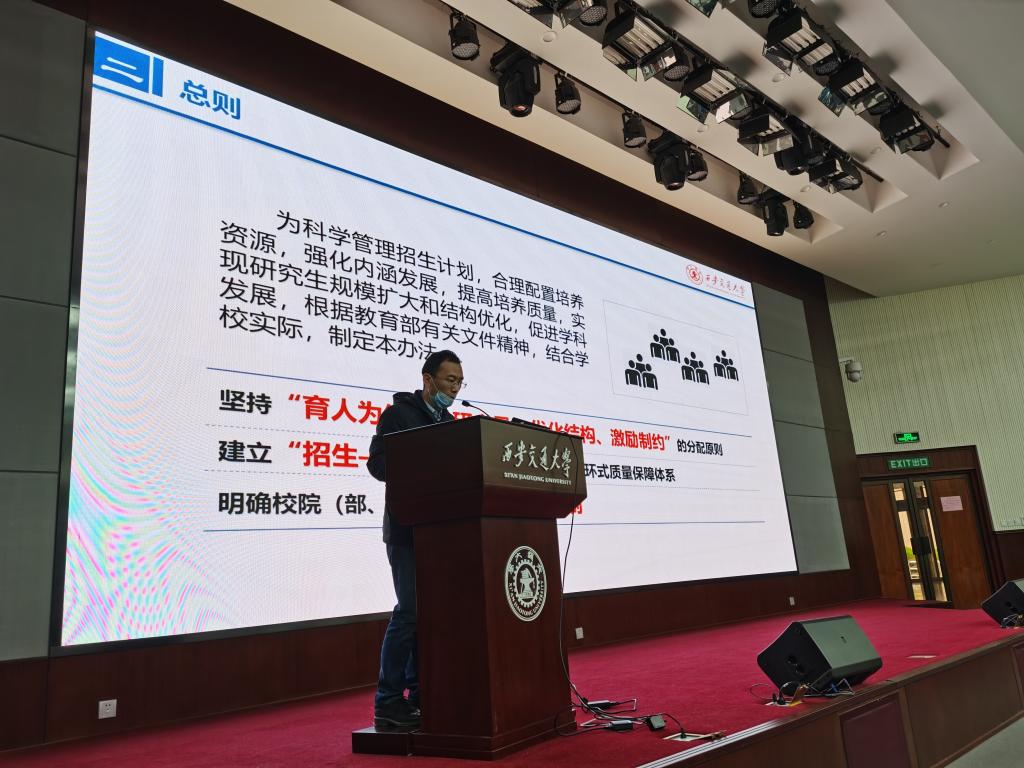 南文海以“导向更明确、机制更完善、标准更具体、体系更透明、改革更系统”概括了《研究生招生计划管理办法》的修订。他详细解读了研究生招生基本计划、激励计划、专项计划三个计划分配维度,培养单位“三优先、一确保、一落实”的分配依据,导师资格、团队指导、深化改革、动态考核等质量保障措施,并对下一步工作进行布置。