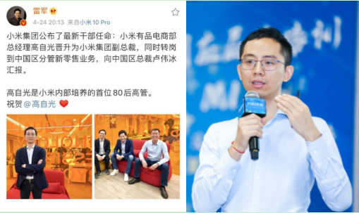 4月24日,小米科技创始人、董事长雷军在其微博发布消息,小米集团公布了最新干部任命,小米有品电商部总经理高自光晋升为小米集团副总裁,同时转岗到中国区分管新零售业务,并称高自光是小米内部培养的首位80后高管。小米科技官网管理团队页面中,高自光已显示为副总裁。