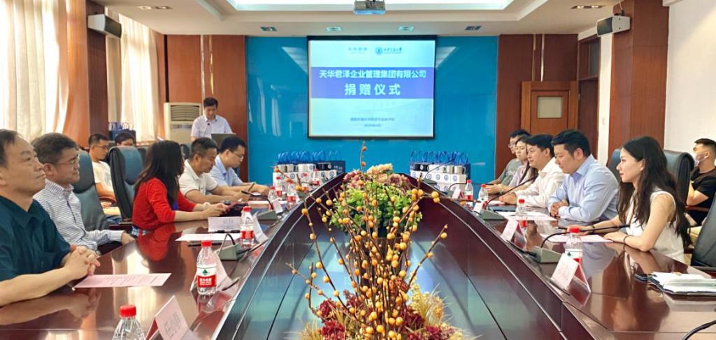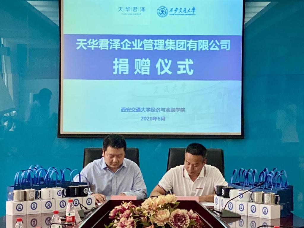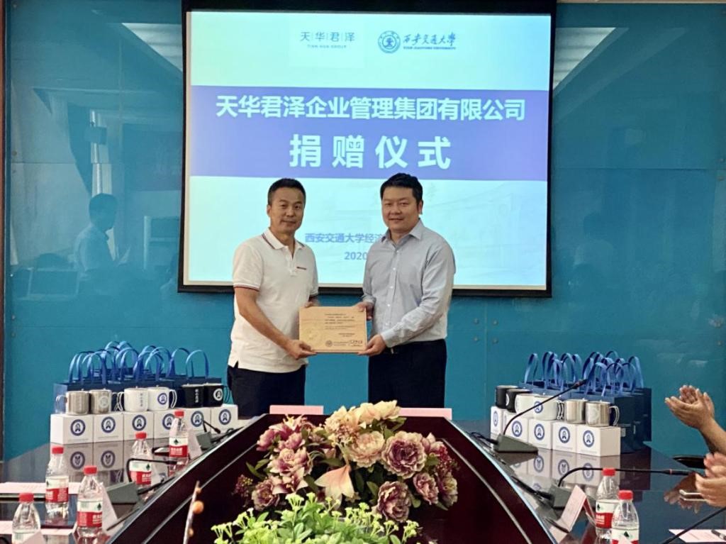 在经金学院建院20周年之际,广大校友积极向学院捐款捐物,为学院发展添砖加瓦。适逢毕业季,北京天华君泽集团合伙人、西安分公司总经理田立川校友向学院捐赠1200套毕业生纪念礼品套装,用于赠送2020级毕业生。6月12日,捐赠仪式在经金学院举行。田立川、公司副总经理王福厚,经金学院院长孙早、党委书记宋丽颖,教育基金会副理事长、秘书长赵卫滨,副秘书长邢晓强等出席仪式。经金学院党委副书记周建伦主持仪式。